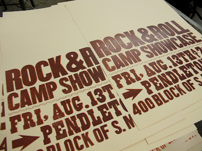 This is my fourth year teaching at the rock camp in Pendleton, OR. Every year ten to fifteen Portland musicains/artists travel east to Pendleton and teach 75 or so teens. There are classes, discussions, zines, lunches, clapping, and a lot of noodling. But the main thing the kids get out of camp is that they form bands, write a song or two and as counselors we help them play them over and over again until our ears cry. At the end of the week they perform in front of the whole town on a stage in the middle of Main street. It is inspiring to say the least. Well I hand set these posters for the showcase tonight. i left the top half blank so the kids can finish the job. i'll post some photos when i get back.